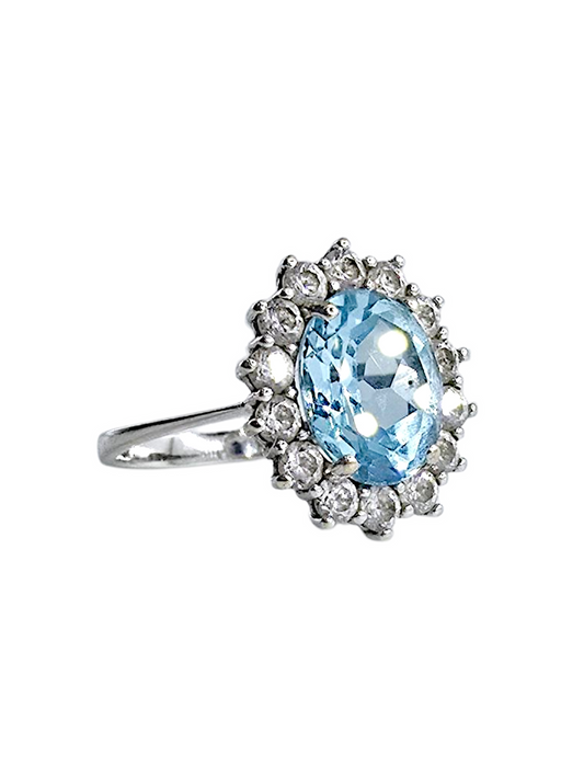 Anello realizzato e rifinito a mano in Italia in oro bianco 18kt e topazio celeste incastonato a 4 griffes e zirconi bianchi.