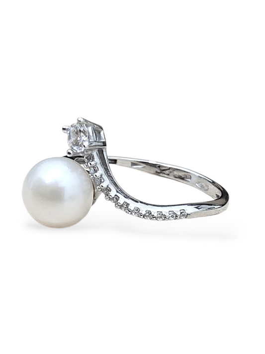Delicato e classico dalla forma sinuosa questo anello è stato realizzato in oro bianco 18kt con perla e zirconi taglio brillante.