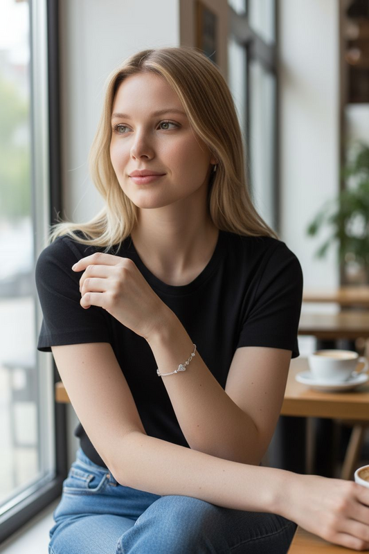 Bracciale realizzato e rifinito a mano in Italia oro bianco 18kt con catenella rolò e cuoricini zirconati da entrambe i lati. Completo di elegante packaging e certificato. Peso complessivo : 3,5 gr circa Lunghezza massima: 19,5 cm Dimensioni cuoricini: 6x6 mm LE IMMAGINI SONO PURAMENTE A SCOPO ILLUSTRATIVO, IL PRODOTTO...