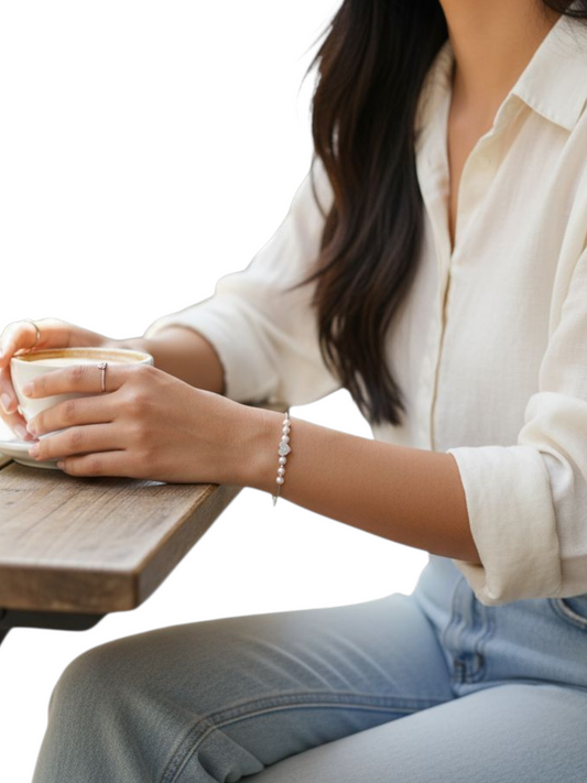 Bracciale realizzato e rifinito a mano in Italia in oro bianco 18kt con cuore pave' di zirconi e perle di fiume.