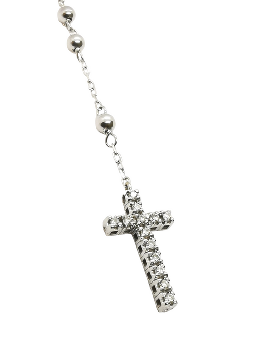 Rosario realizzato in oro bianco 18kt con grani a finitura lucida, medaglietta raffigurante la Madonna miracolosa e la crocetta impreziosita da 13 diamanti naturali taglio brillante. Il modello è quello classico con 5 decine di grani più quelli che intervallano la preghiera del Padre Nostro. Realizzato e rifinito a mano...