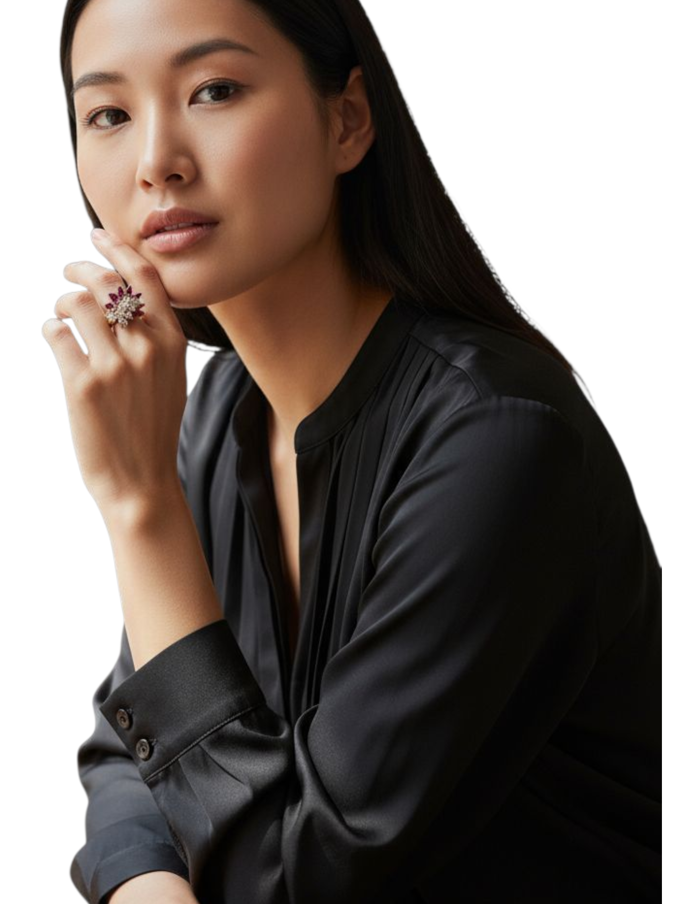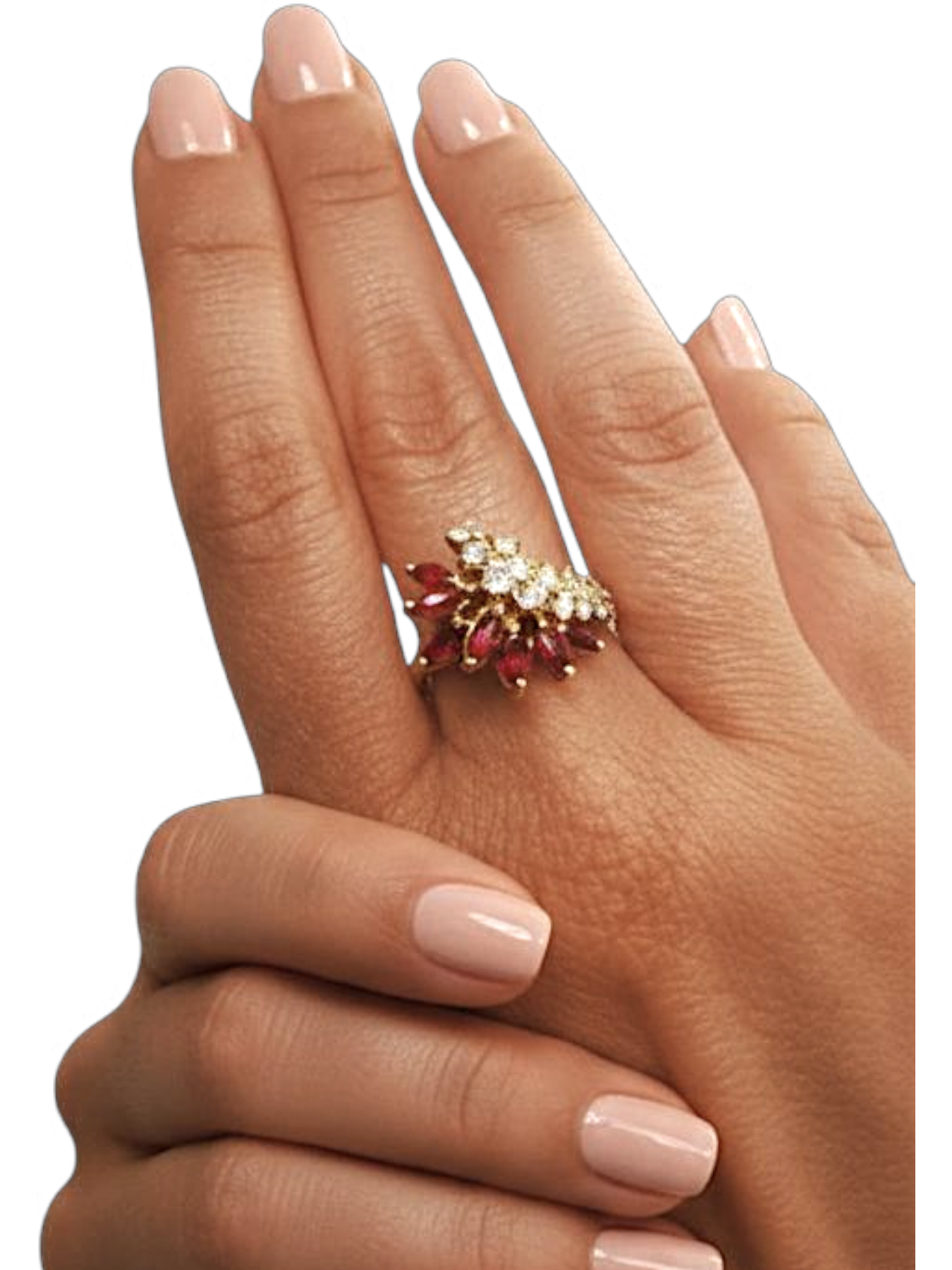 Anello molto elegante realizzato in oro giallo 18kt con 7 rubini naturali taglio navette incastonatia 2 griffes arrotondate e 13 diamanti naturali di varie dimensioni incastonati a 3 griffes arrotondate.