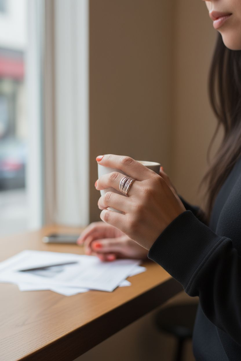 Anello a fascia in oro bianco con particolare lavorazione laser che si alterna a quella lucida. La parte centrale lascia intravedere la pelle dando leggerezza a tutto l'anello.