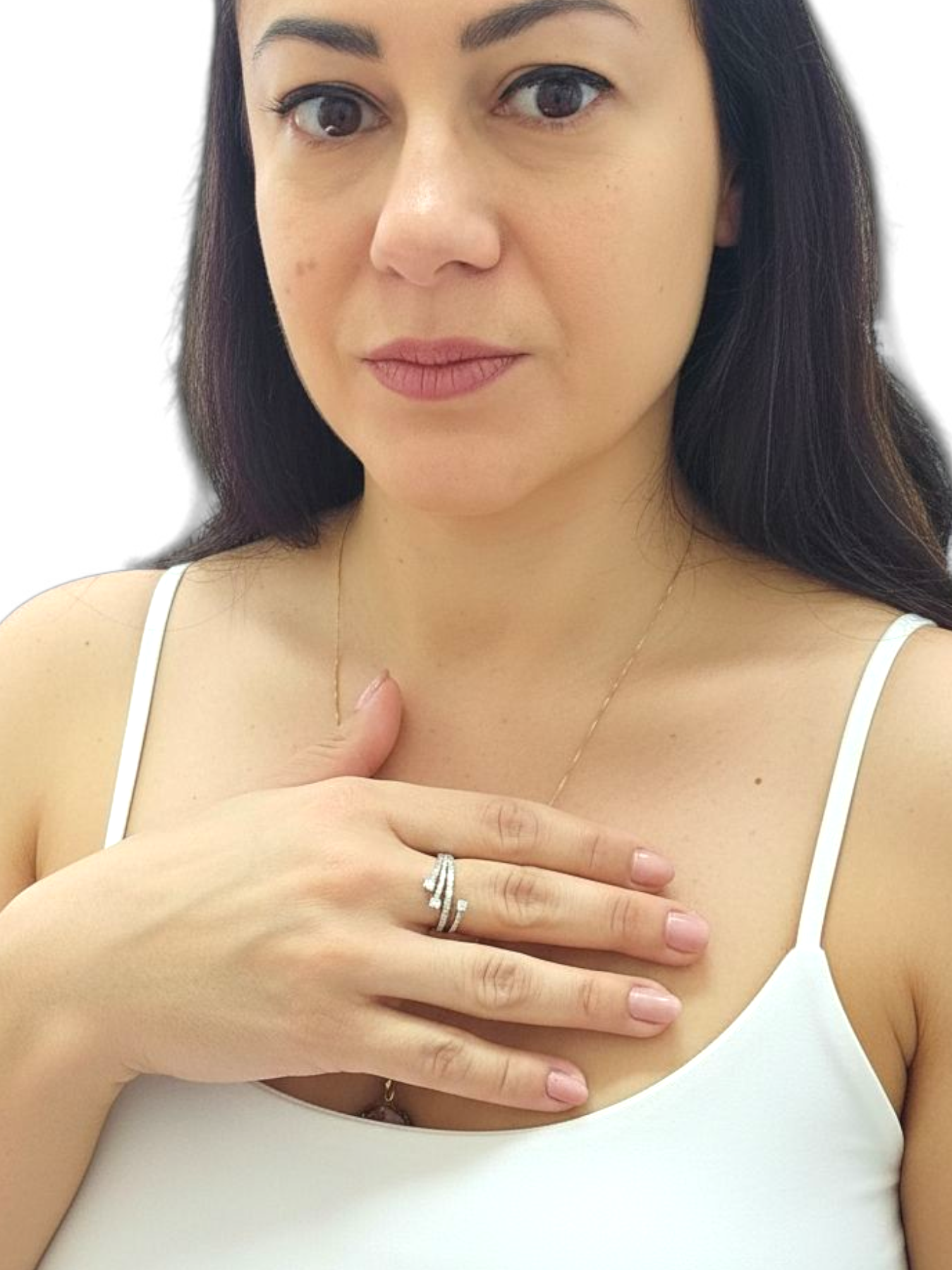 La composizione a più livelli è accentuata da tre zirconi taglio brillante strategicamente posizionati, che aggiungono un tocco di tridimensionalità e lusso. È il pezzo perfetto per chi ama uno stile contemporaneo ma sofisticato, ideale da indossare in occasioni speciali o per elevare l'outfit di tutti i giorni.
