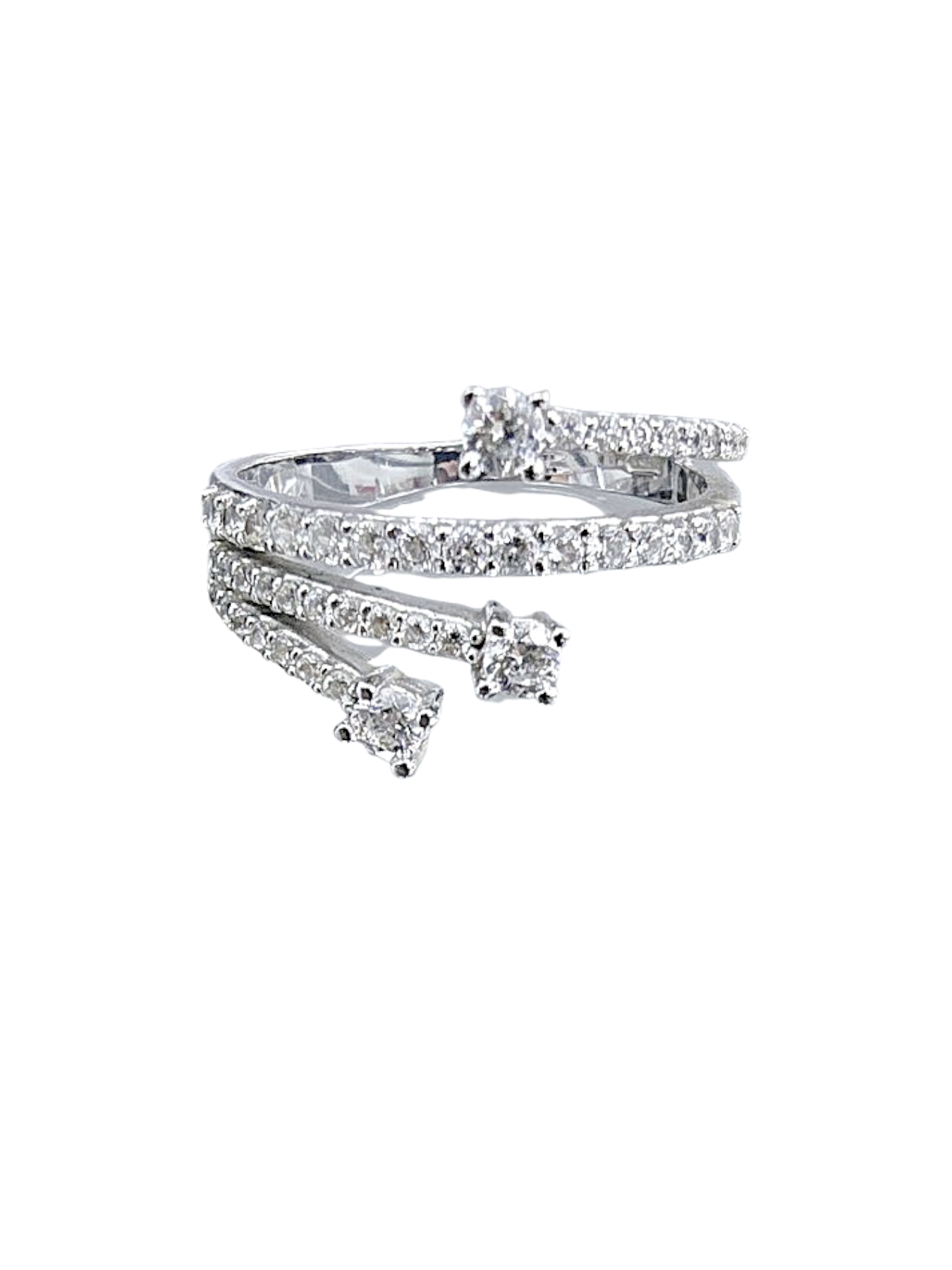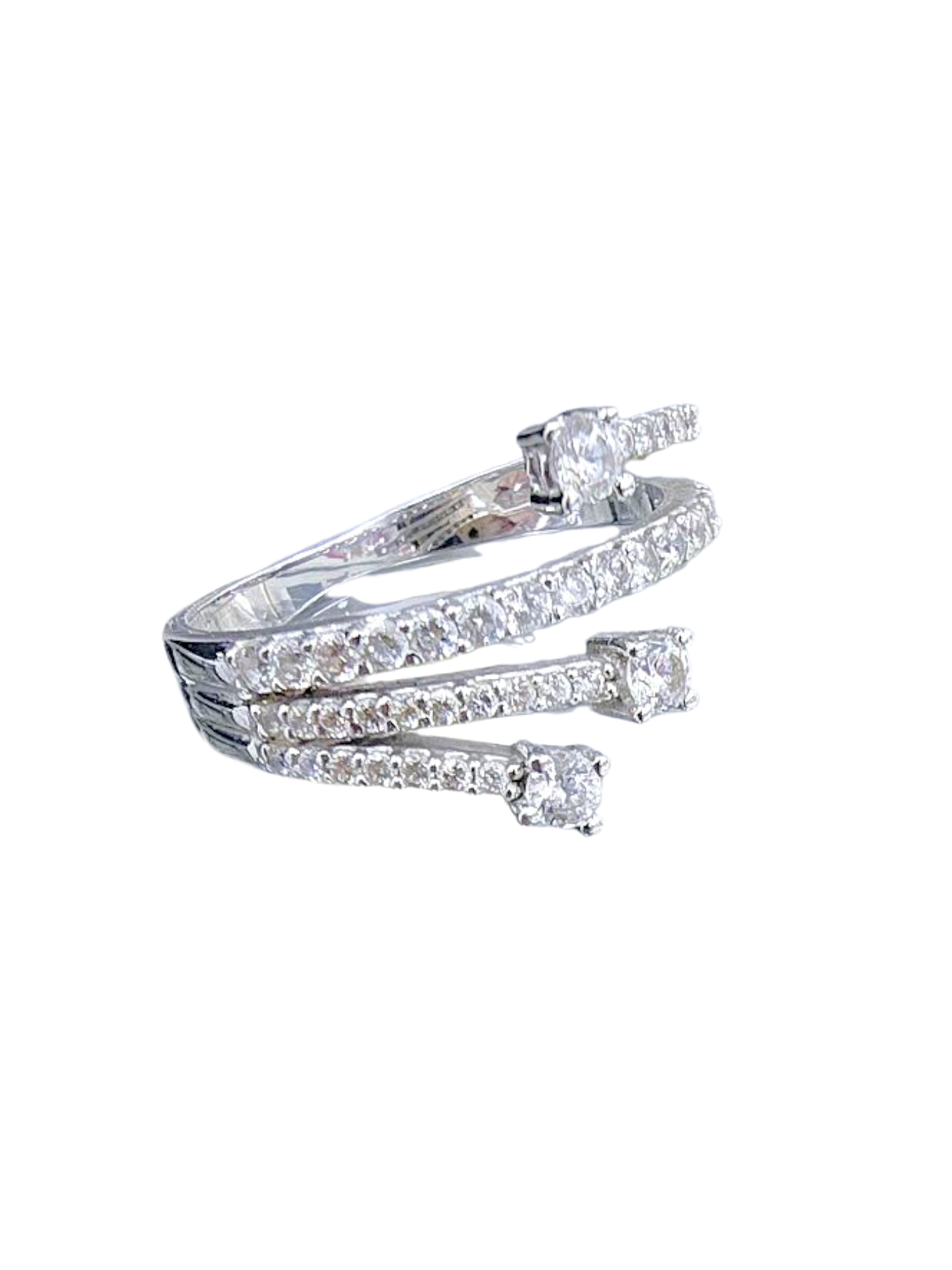 Realizzato in pregiato Oro Bianco 18 Carati, questo gioiello presenta un design unico che abbraccia la mano con linee sinuose. Le fasce sono interamente impreziosite da brillanti zirconi, che catturano e riflettono la luce a ogni movimento.