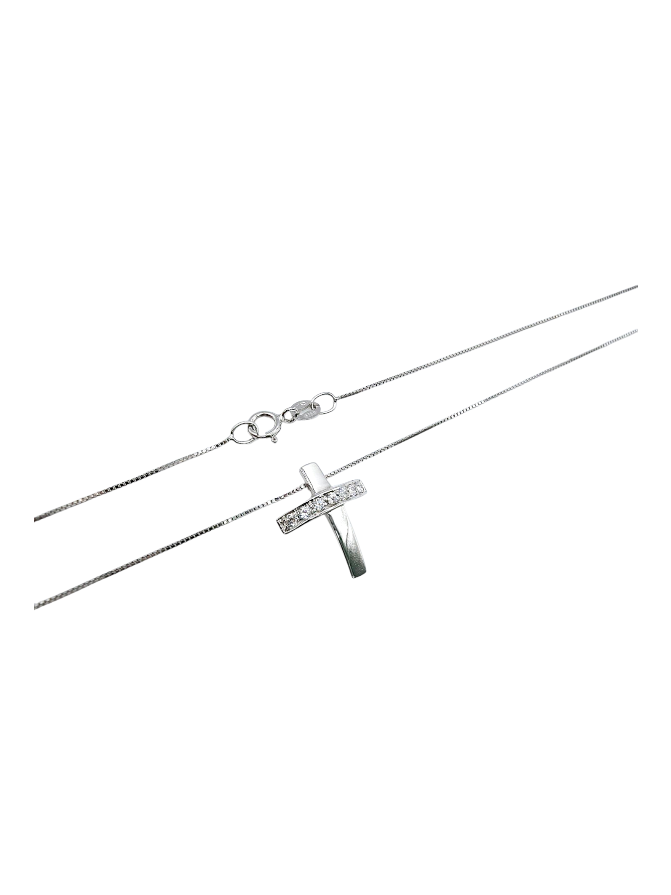 Il pendente a crocifisso presenta un design minimalista e contemporaneo, con la barra orizzontale impreziosita da un pavé di brillanti zirconi luminosi.
