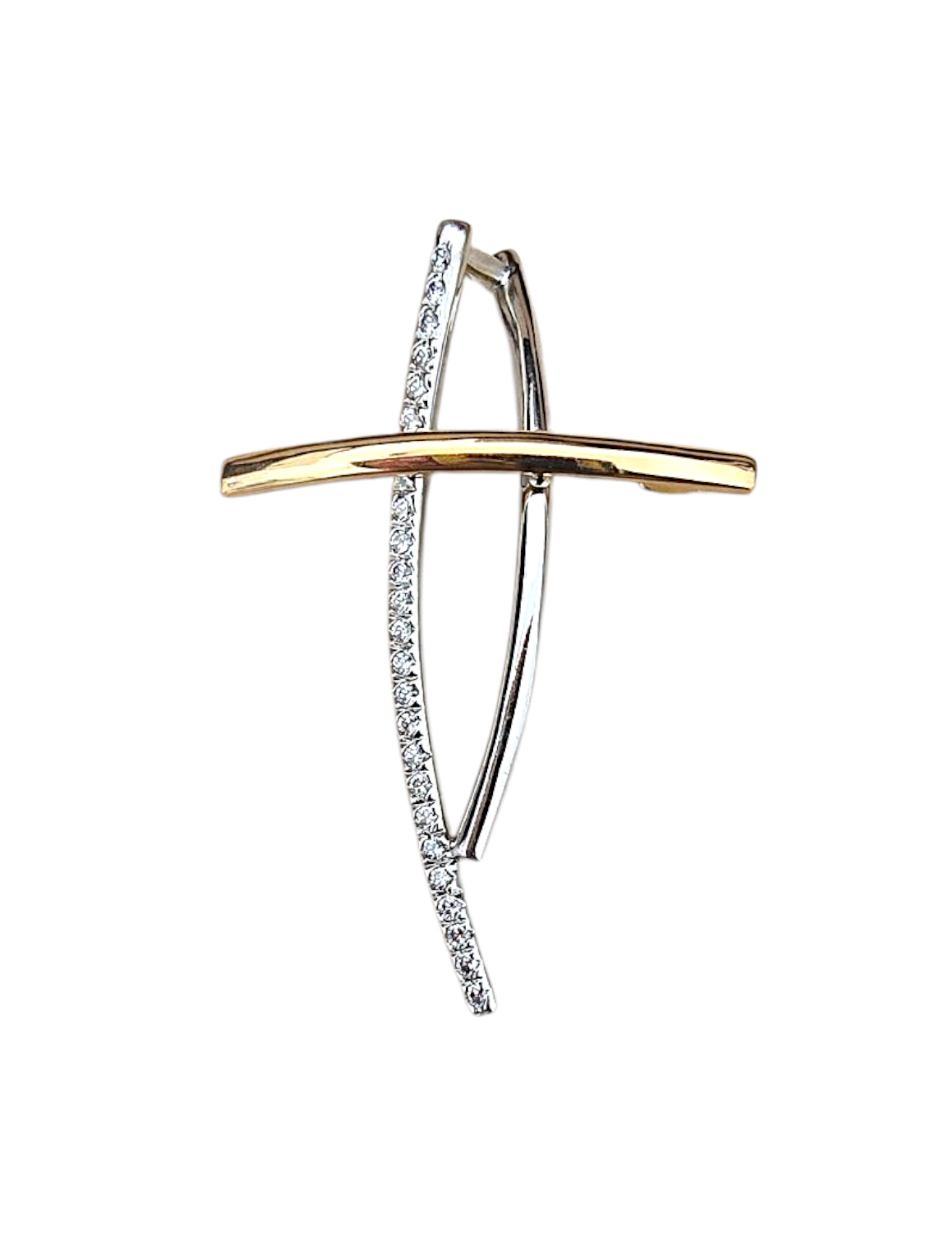 Ciondolo realizzato in oro bianco e giallo 18kt raffigurante croce bicolore stilizzata arricchita da 23 zirconi taglio brillante incastonati.