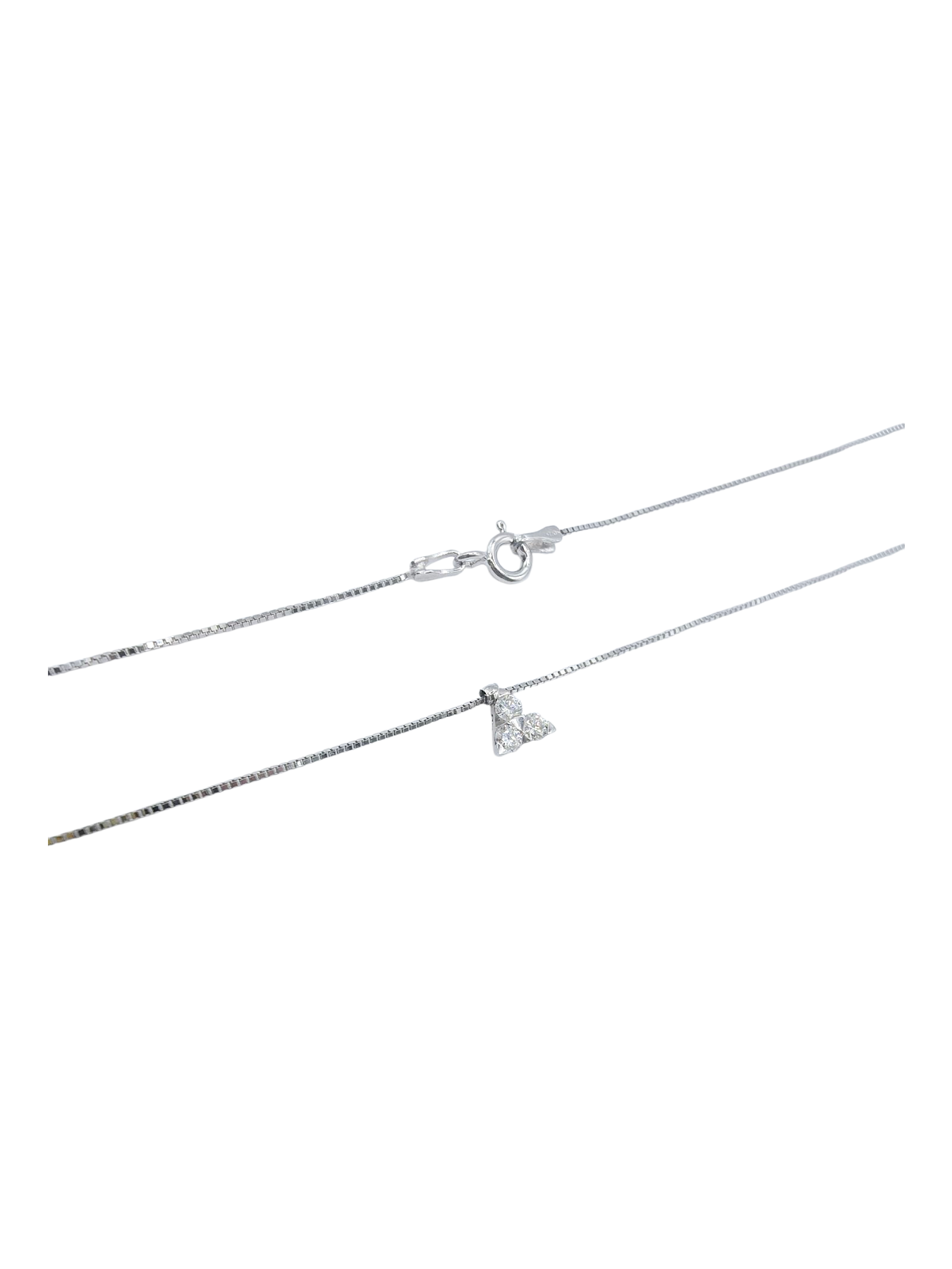 - Oro 18 Carati (750/°°): La montatura e la catenina sono realizzate nel prezioso Oro Bianco 18kt, sinonimo di durabilità e lucentezza, che esalta il candore dei diamanti.