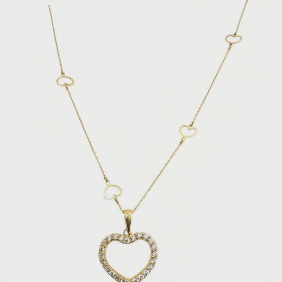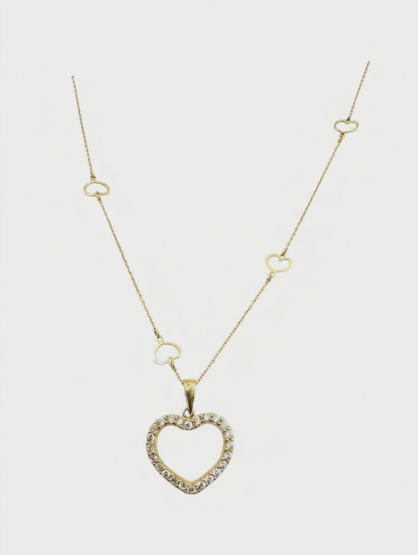 Il girocollo è impreziosito da delicati cuori traforati lungo la catena, che conducono lo sguardo verso il magnifico pendente centrale: un cuore luminoso interamente profilato da zirconi taglio brillante di alta qualità.