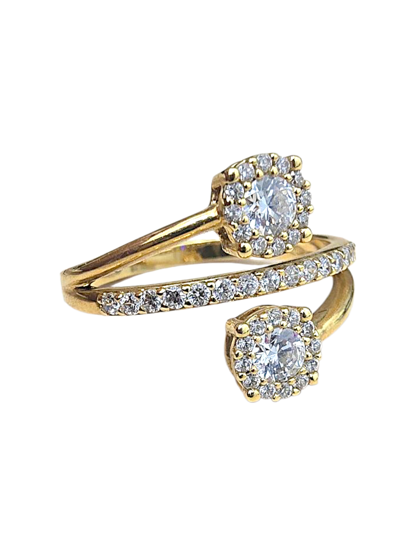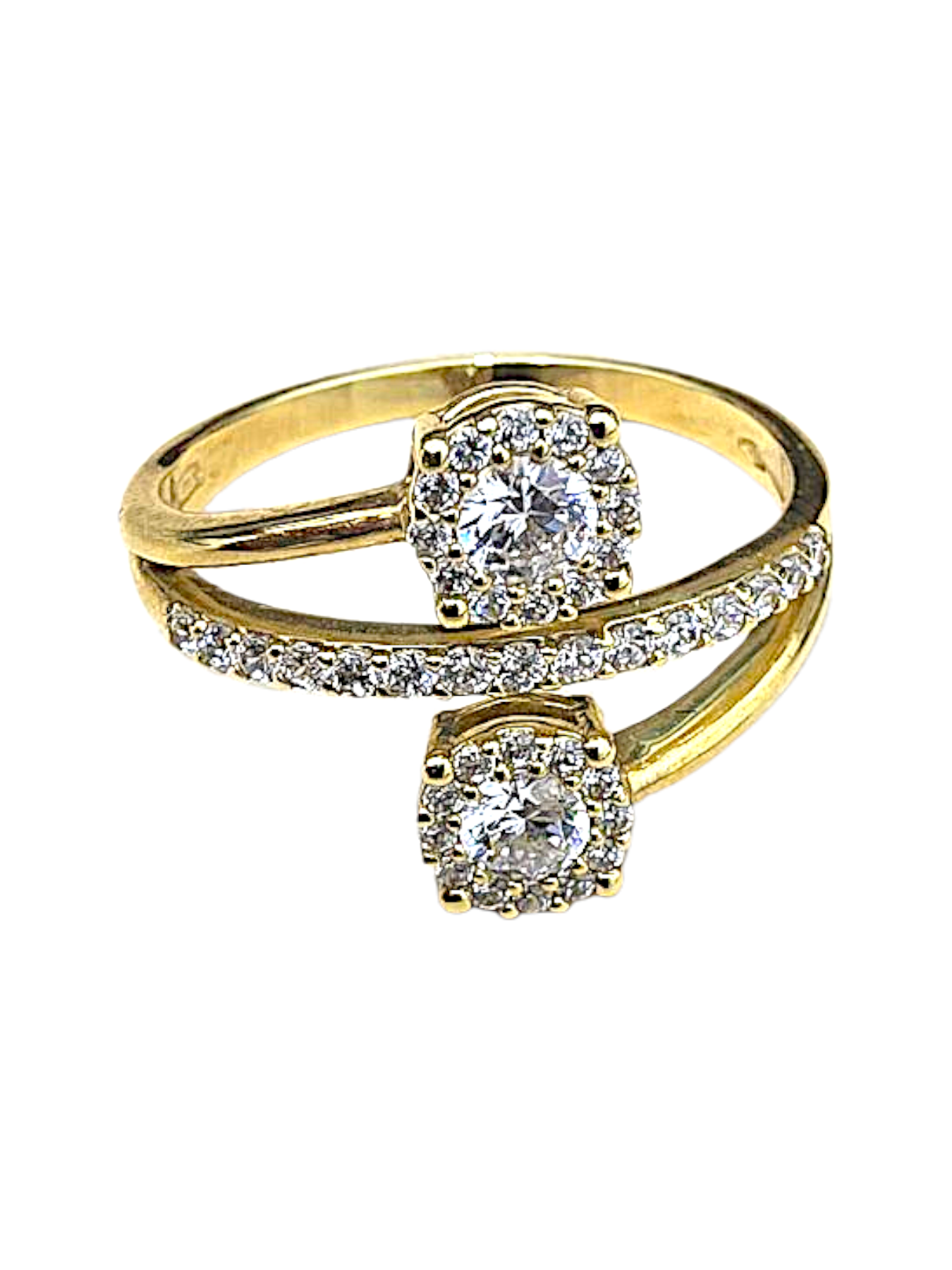 Anello realizzato in oro giallo 18kt modello contrarie' arricchito da luminosi zirconi taglio brillante.
