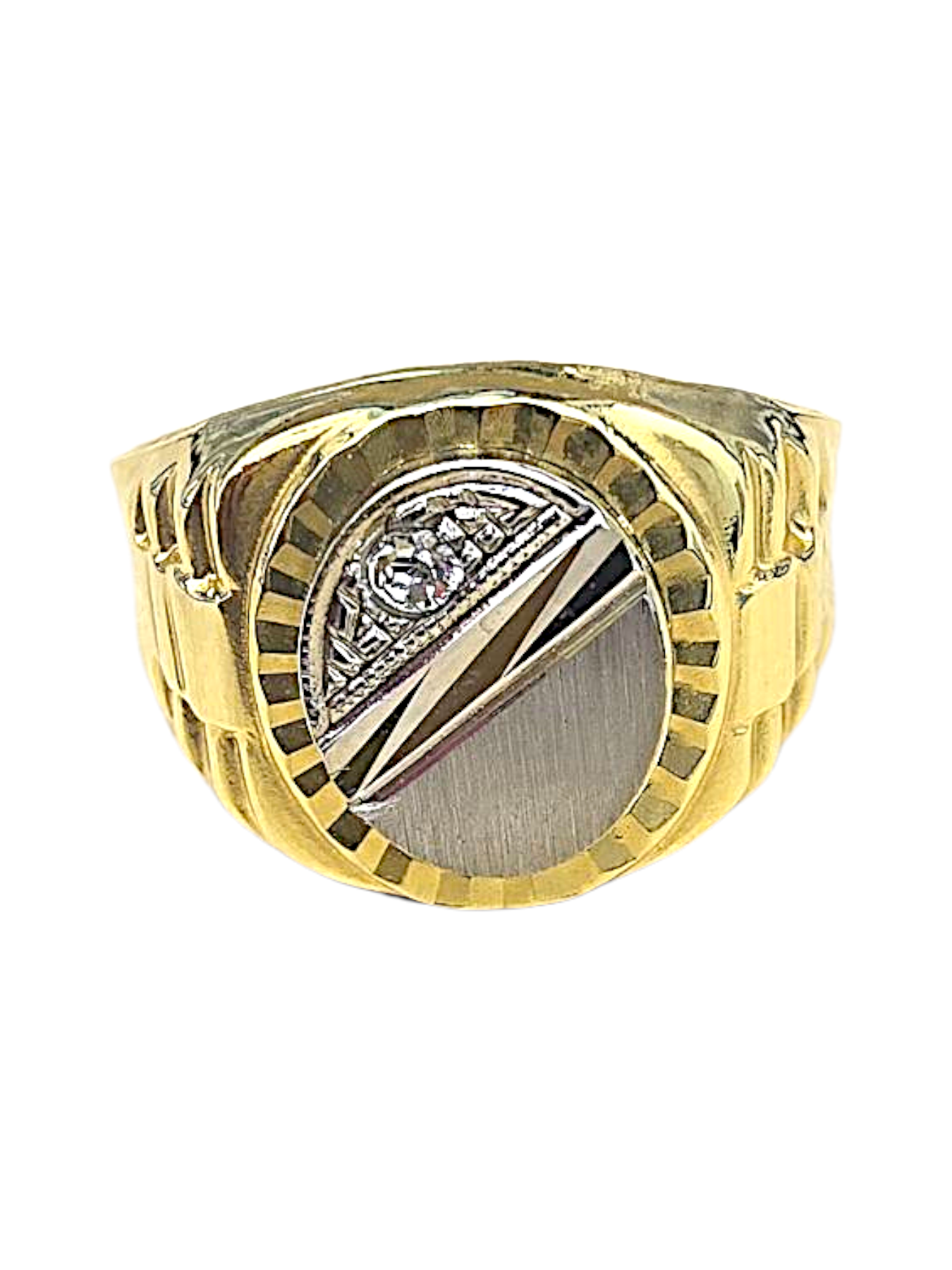 Anello a scudo realizzato in oro bianco e giallo 18kt con lavorazione laterale e arricchito da 1 zircone tondo bianco.