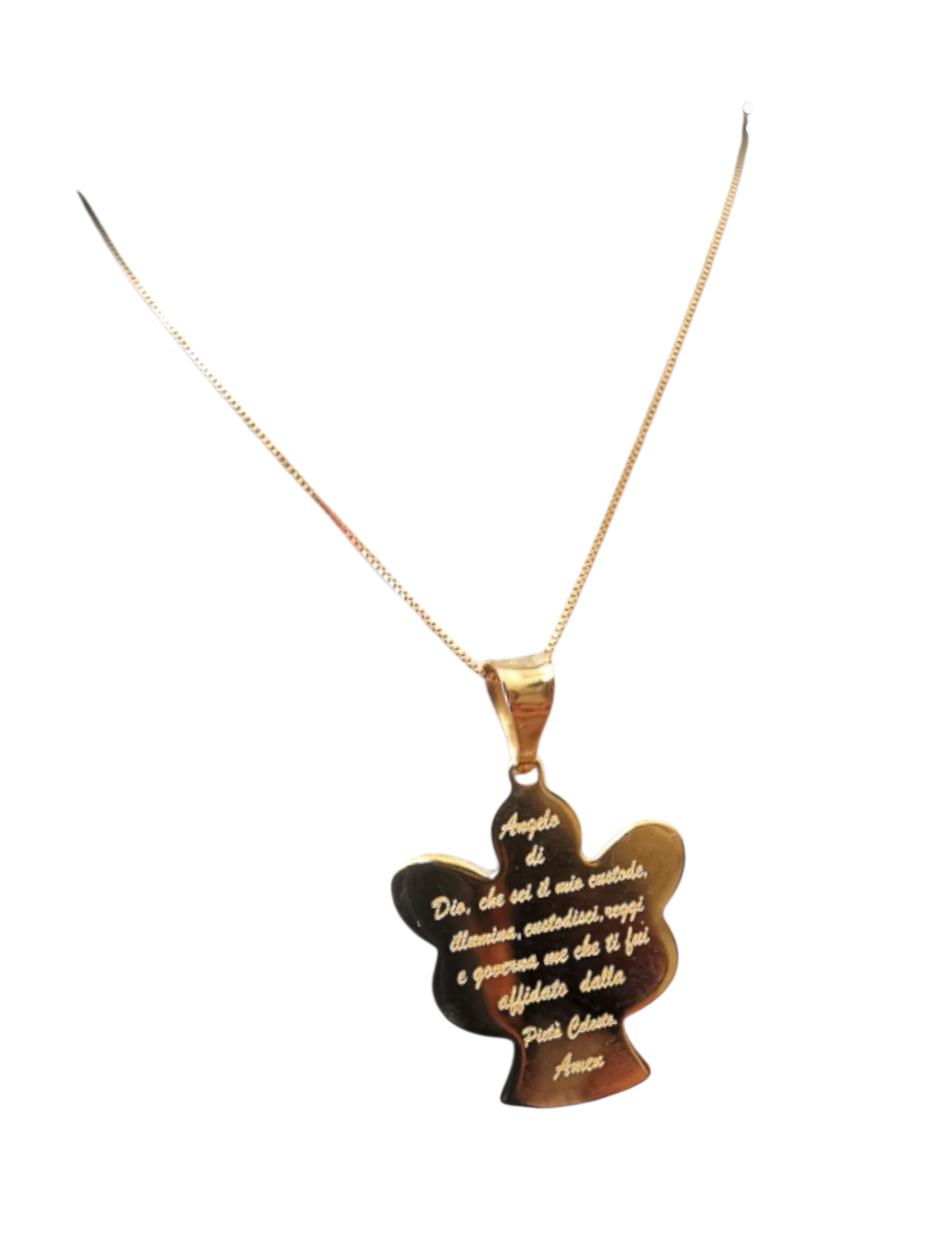 Girocollo realizzato e rifinito a mano in Italia in oro giallo 18kt con ciondolo angioletto a finitura lucida e preghiera '' Angelo di Dio'' incisa a laser.