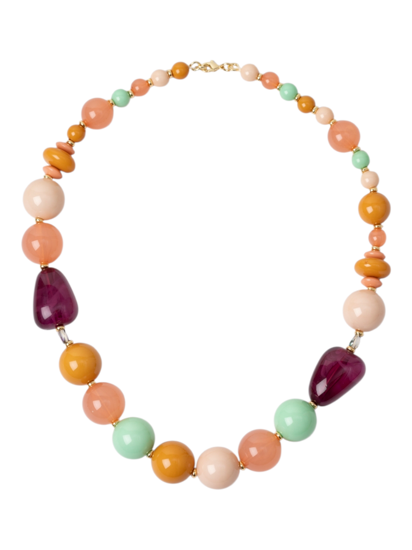 Questa collana è un vero inno al colore e allo stile contemporaneo, firmata Sodini Bijoux. Realizzata con grandi perle in resina dalle finiture lucide, combina sapientemente tonalità calde e pastello: dal pesca all'arancio, dal rosa pallido al verde menta, con accenti di un intenso color uva. Il design è caratterizzato da una composizione asimmetrica di sfere e elementi irregolari, che la rende un accessorio audace e di grande impatto visivo. Perfetta per ravvivare un look monocromatico o per aggiungere un tocco giocoso al tuo outfit.