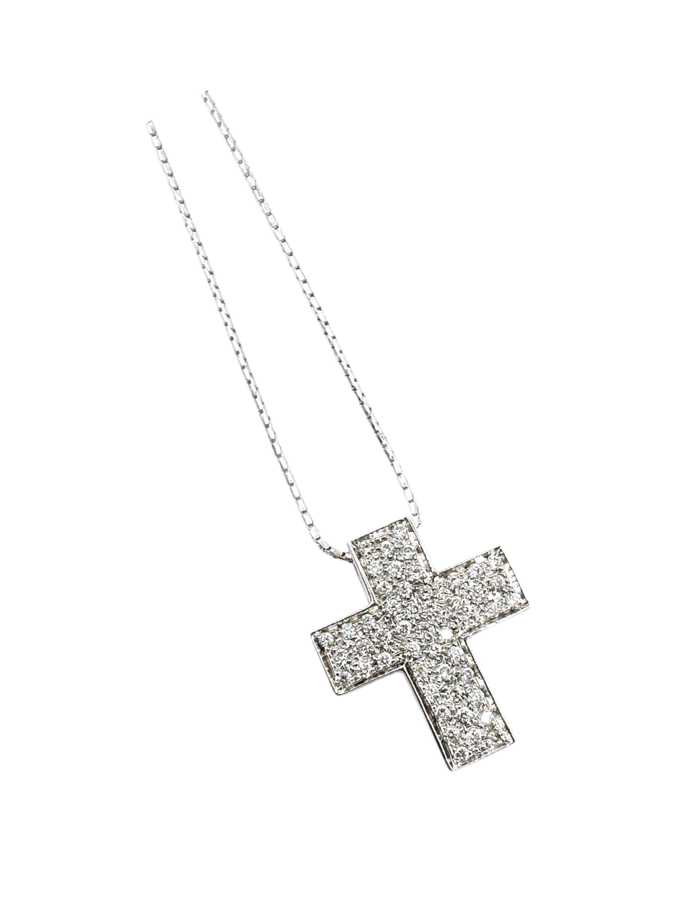 Design: Presenta un pendente a croce dalle linee moderne e pulite, interamente tempestato di diamanti luminosi che ne esaltano lo splendore.
