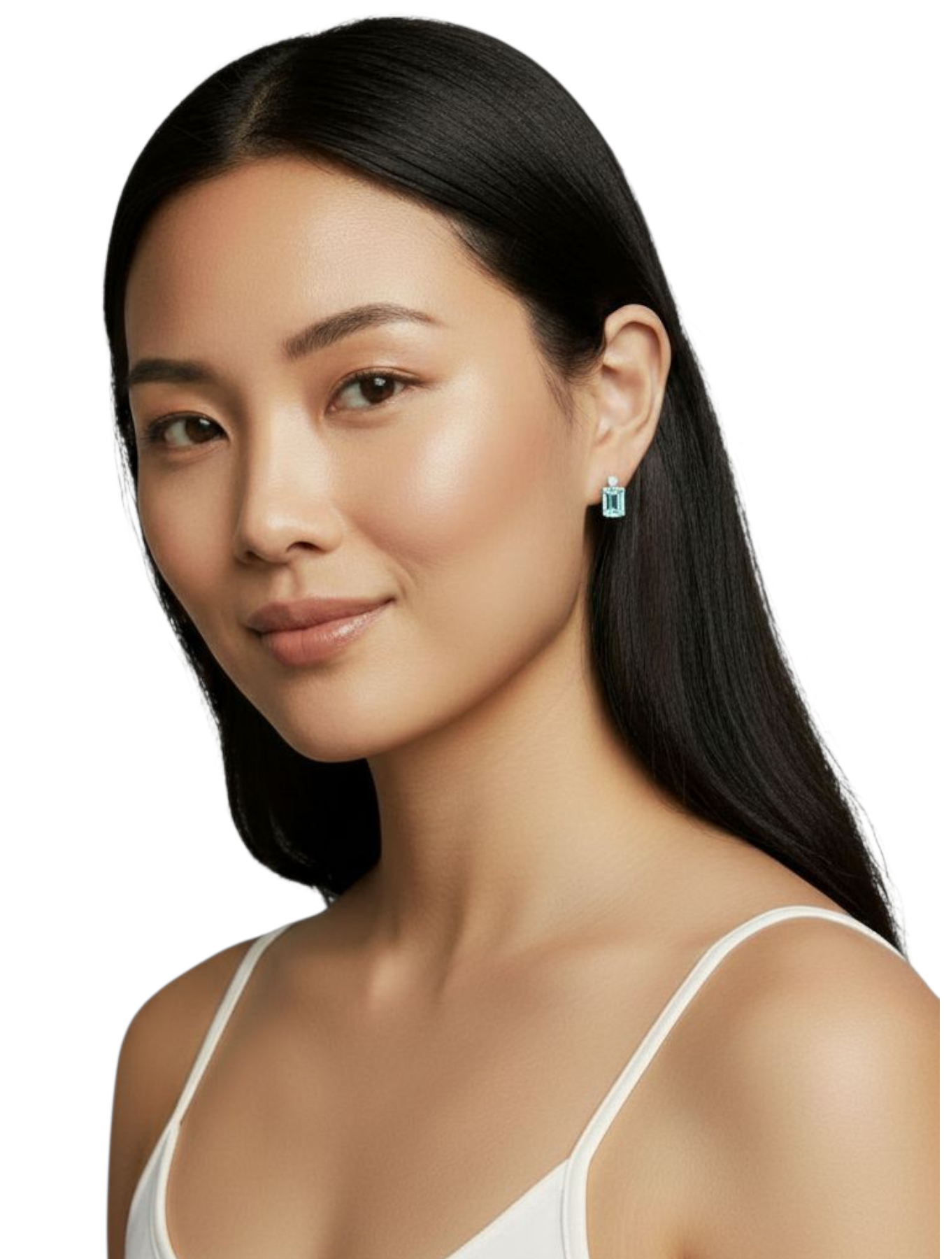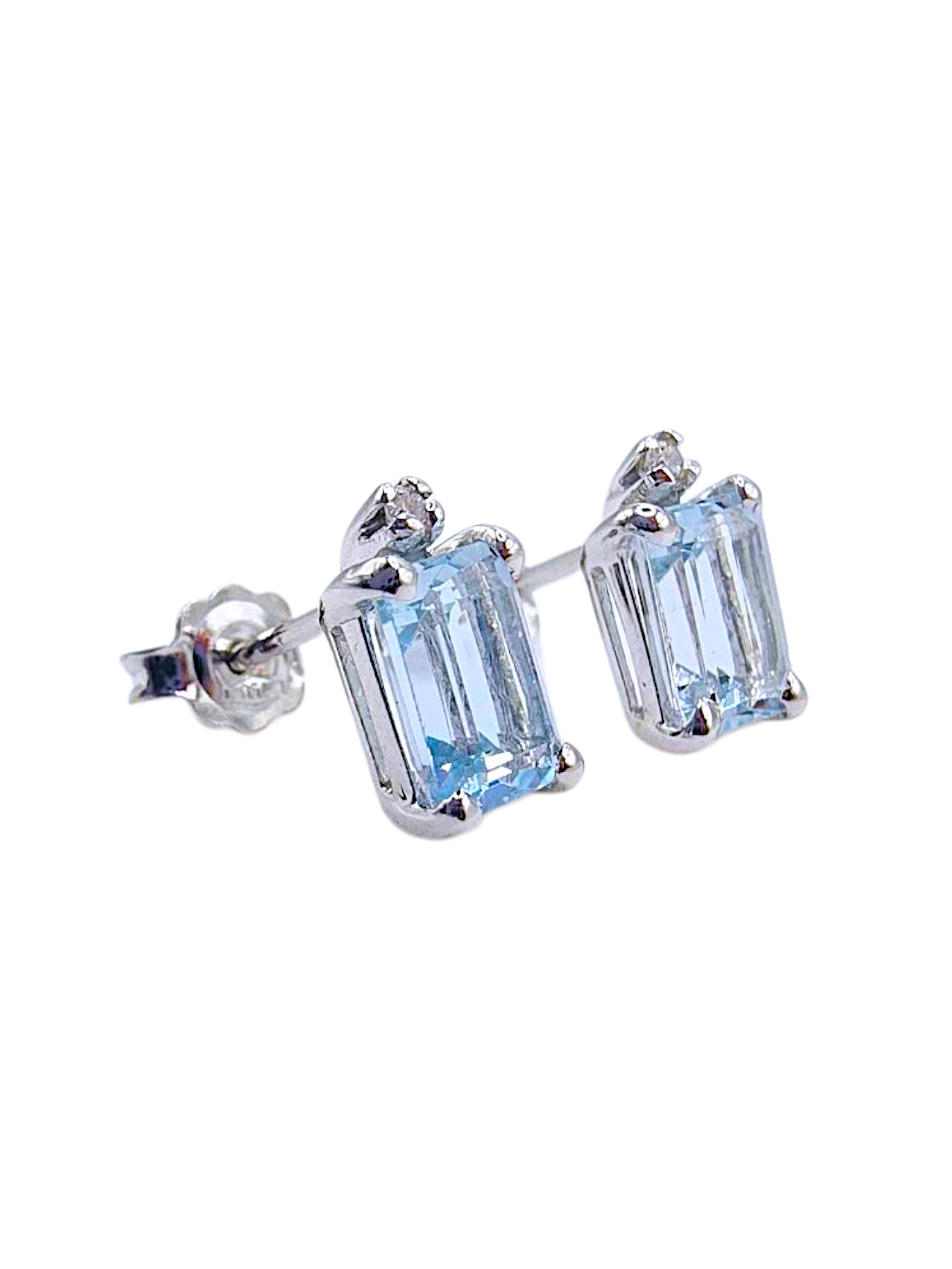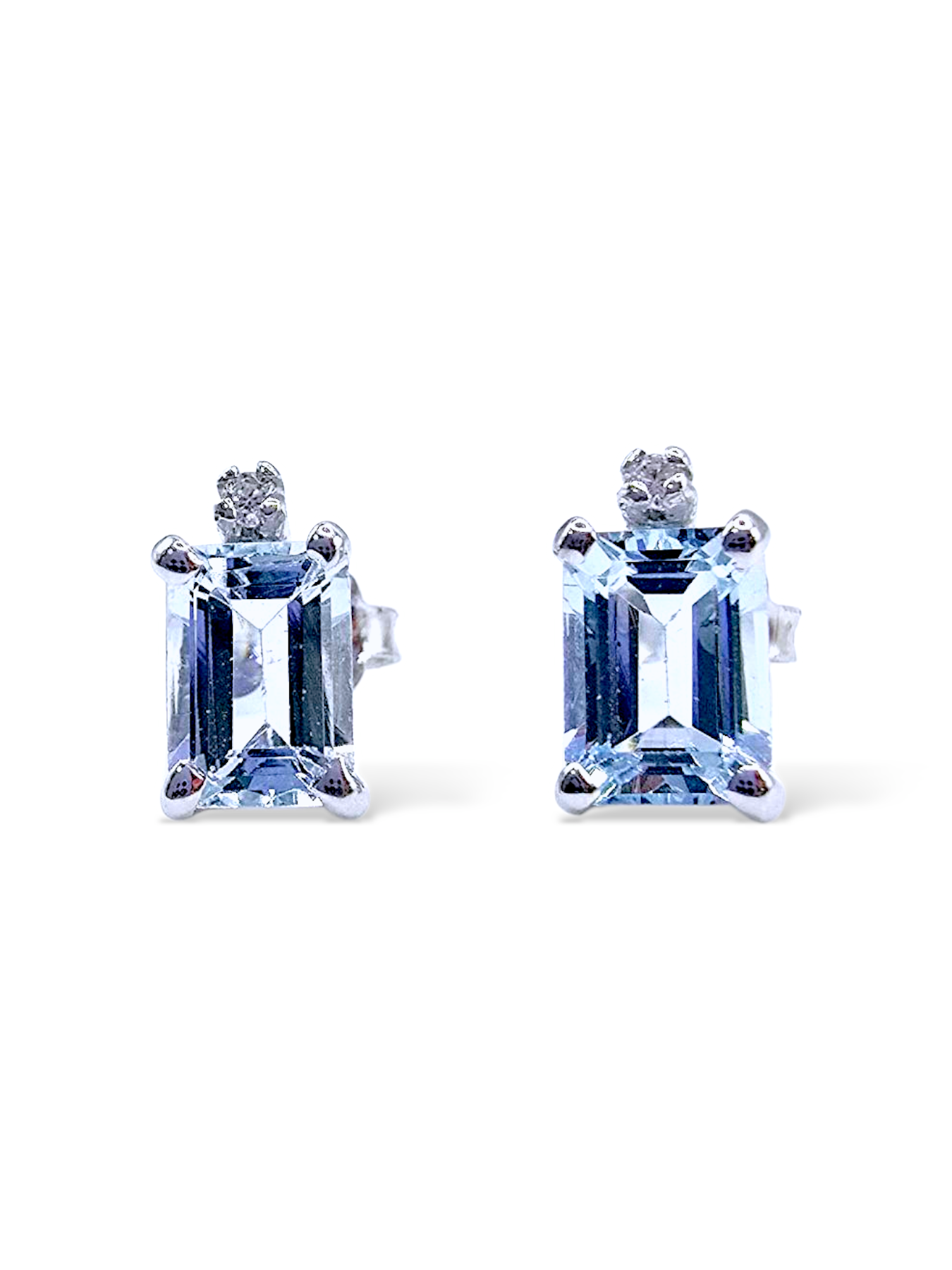 Orecchini realizzati e rifiniti a mano in Italia in oro bianco 18kt e pietre di acquamarina naturale taglio smeraldo e diamante naturale taglio brillante.