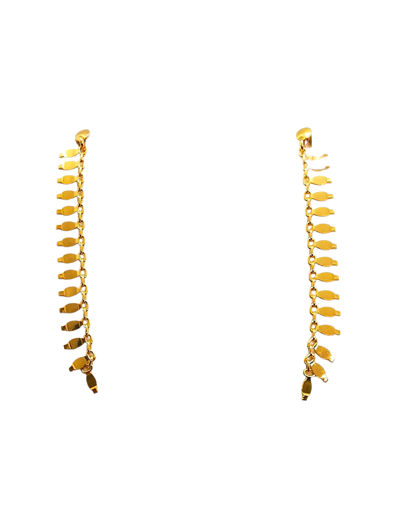 Orecchini realizzati in oro giallo 18kt con catenina rolò e piccoli ovalini piatti a finitura lucida che riflettono la luce.