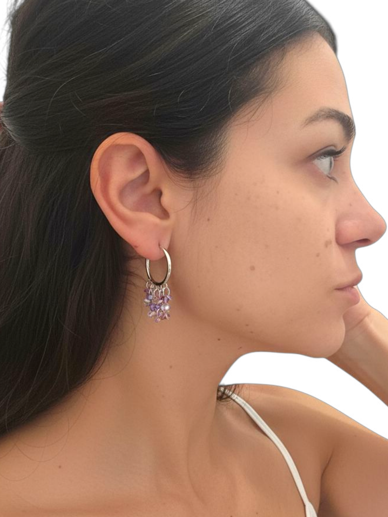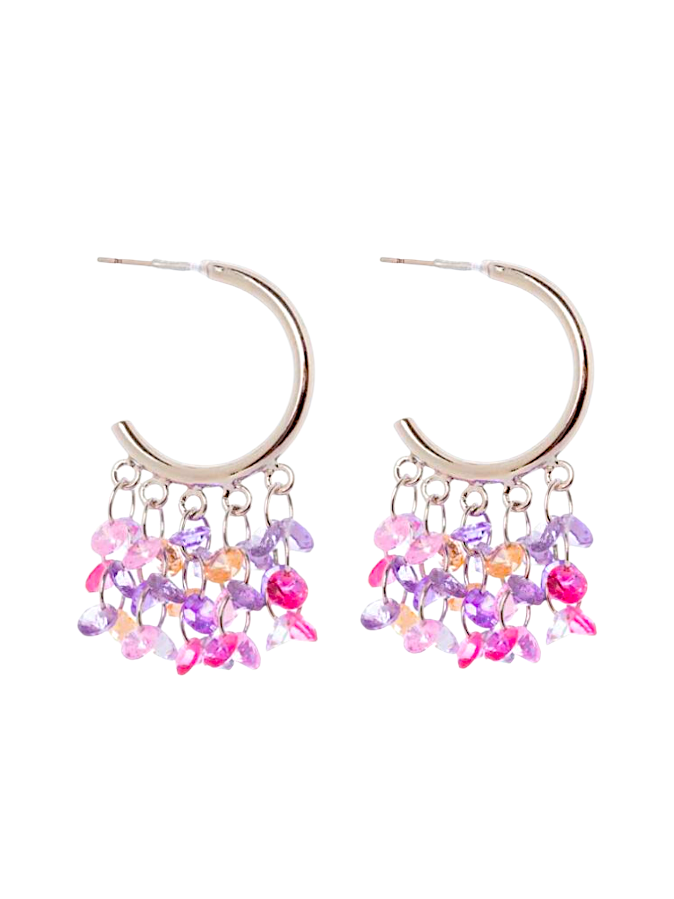 Orecchini a cerchio con pendenti in Ottone anallergico rodiato e Zirconi colorati.