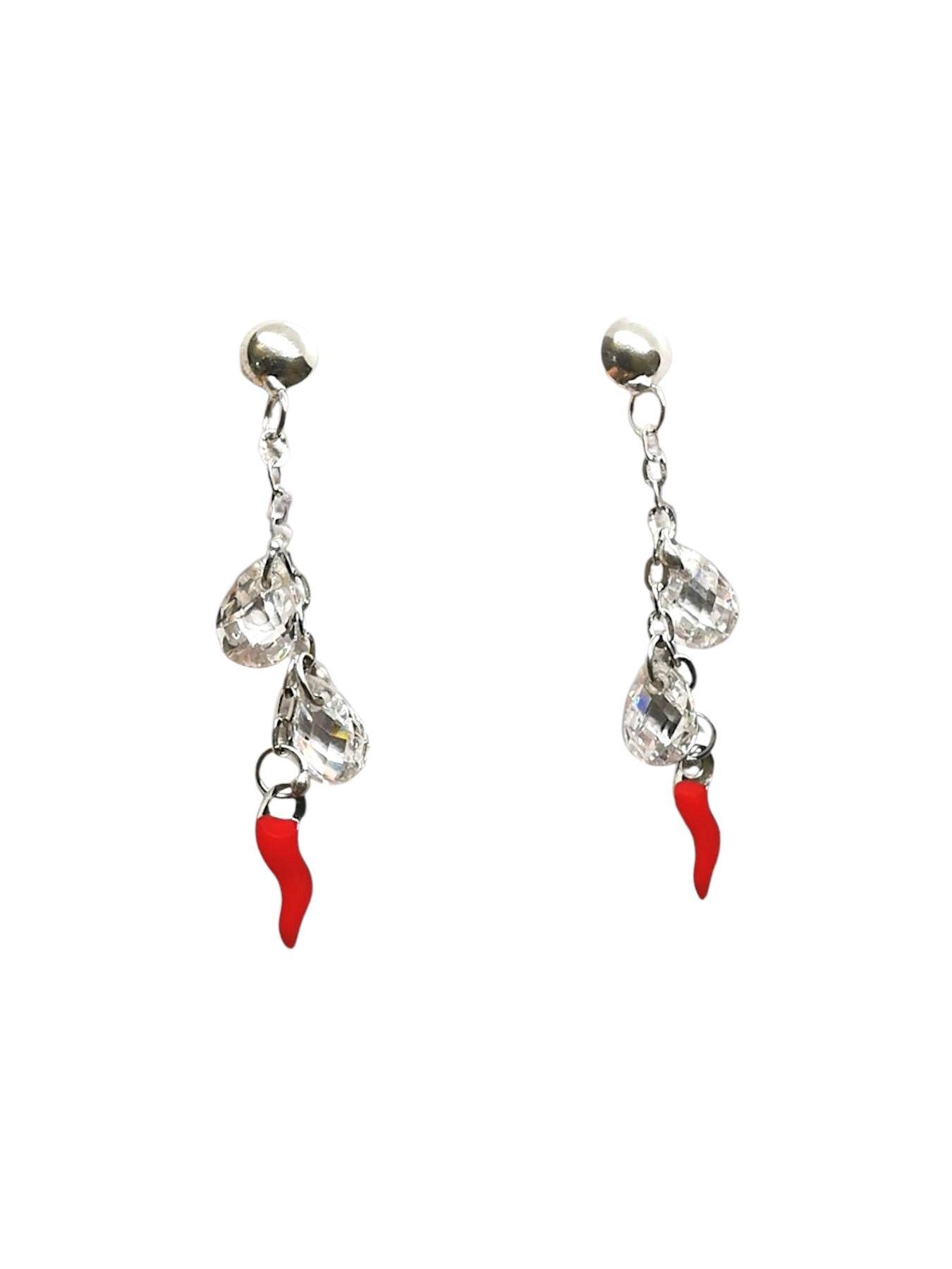 Questi orecchini sono realizzati in prezioso oro bianco 18kt con cristalli trasparenti e cornetti smaltati in rosso.