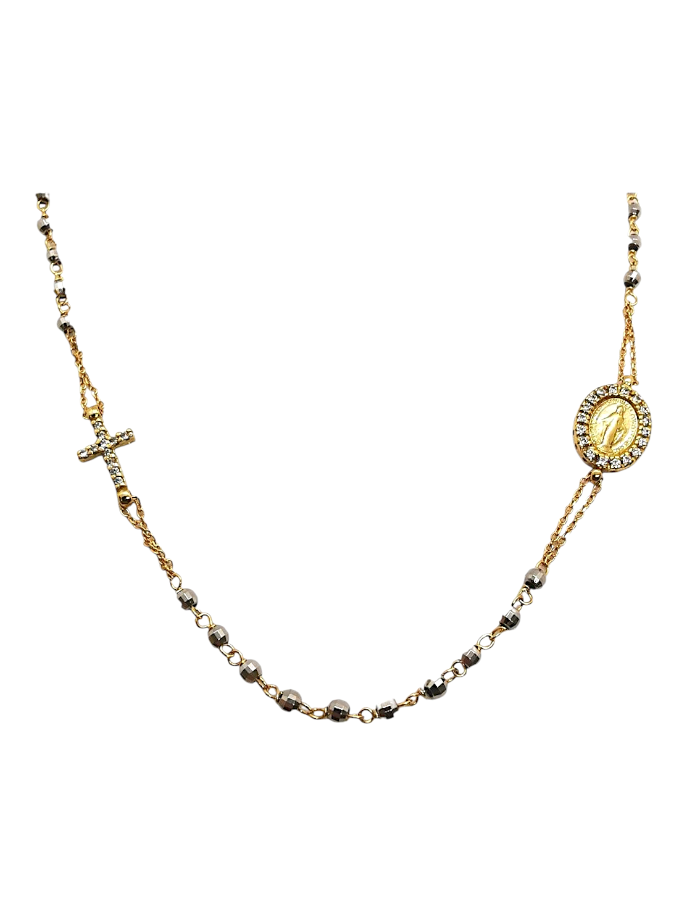 Girocollo realizzato in oro giallo 18kt con grani in oro bianco a finitura lucida sfaccettata e medaglietta Madonna miracolosa e crocetta arricchite da zirconi bianchi double-face.