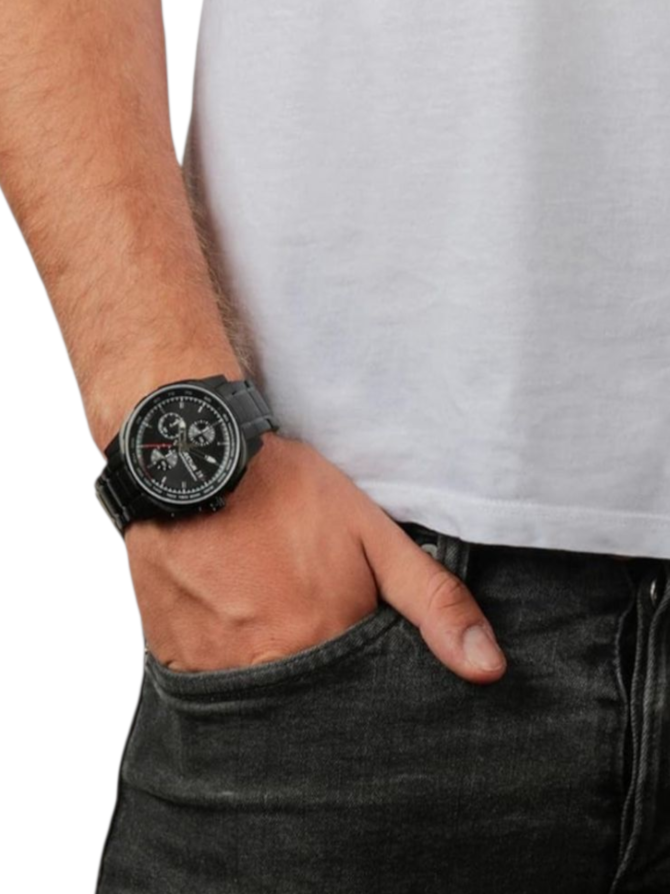 Il bracciale, in acciaio nero coordinato con la cassa, è robusto e dotato di chiusura di sicurezza.