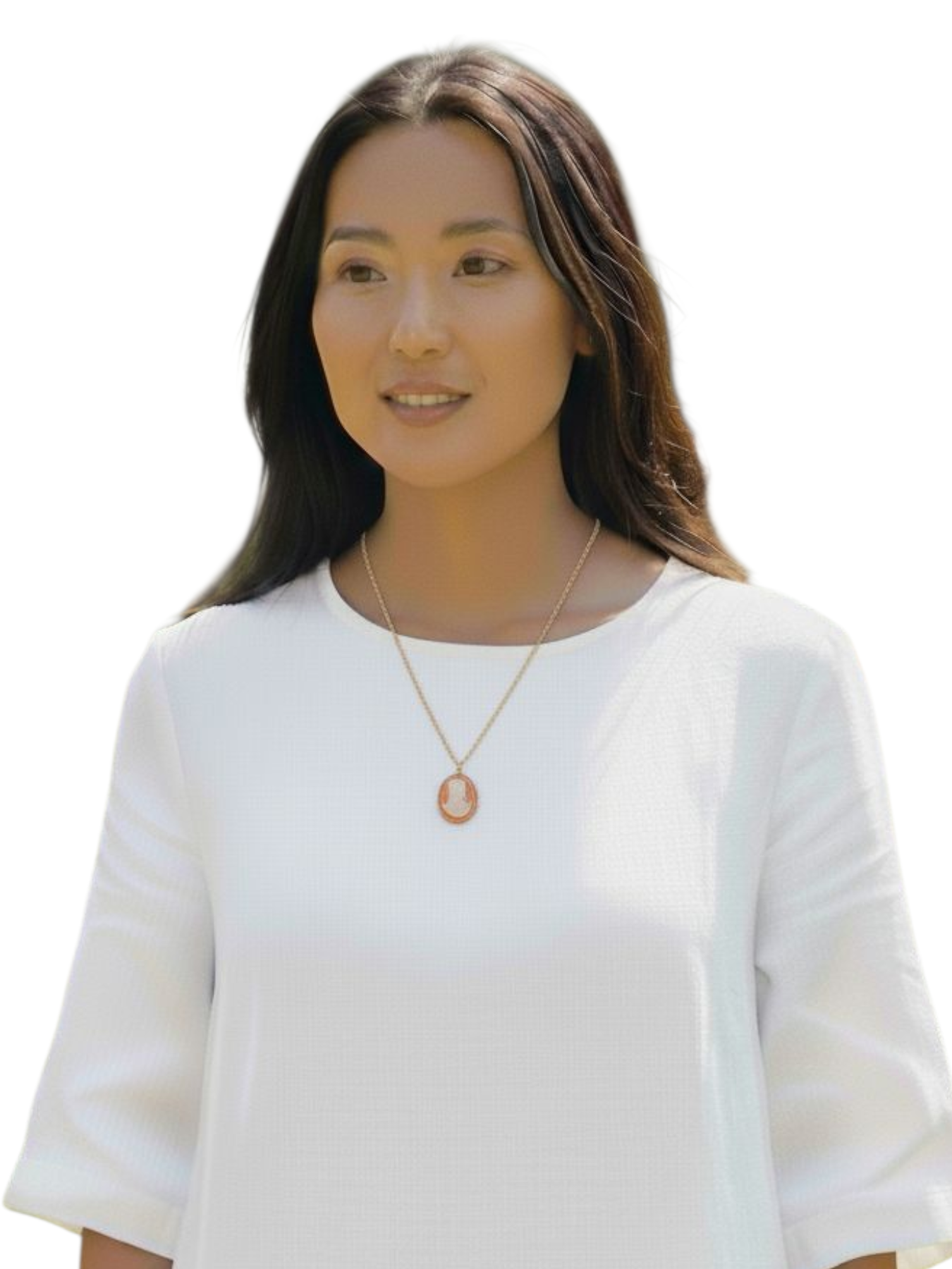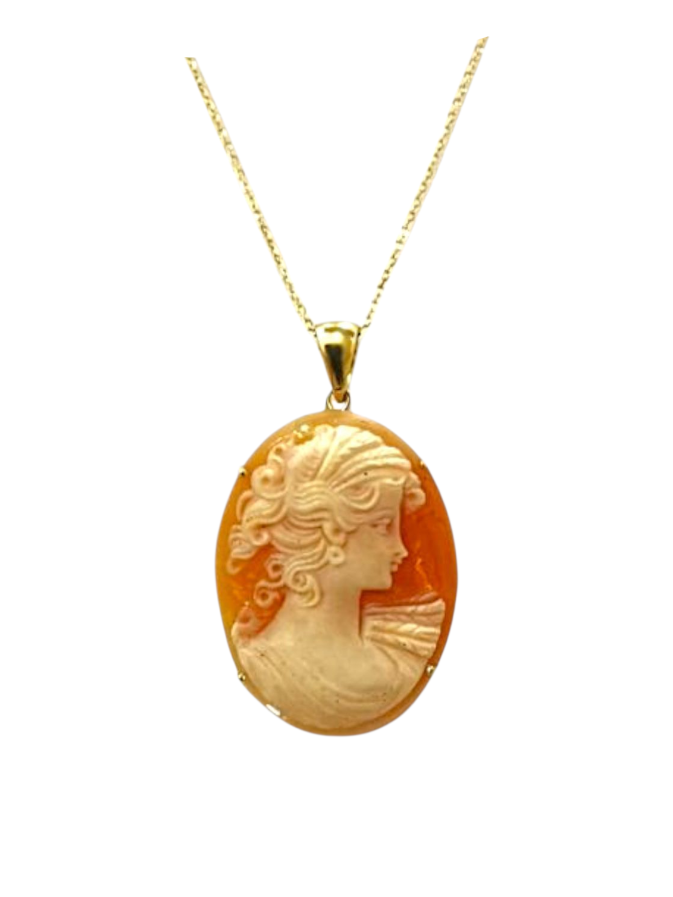 Delizioso girocollo realizzato a mano nel nostro laboratorio orafo formato da girocollo maglia rolò diamantata e ciondolo a 4 griffes con cammeo in corallo.