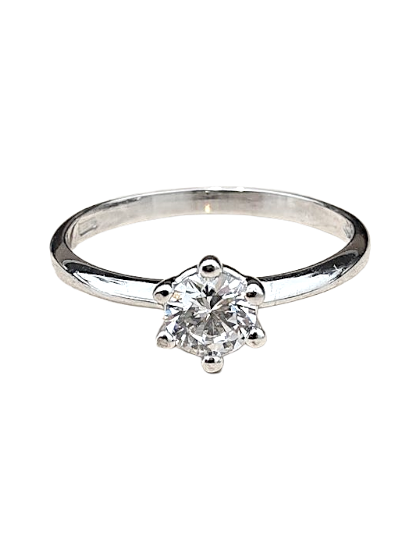 Solitario realizzato in oro bianco 18kt con pietra centrale di zircone taglio brillante e incastonatura tonda a 6 griffes arrotondate.